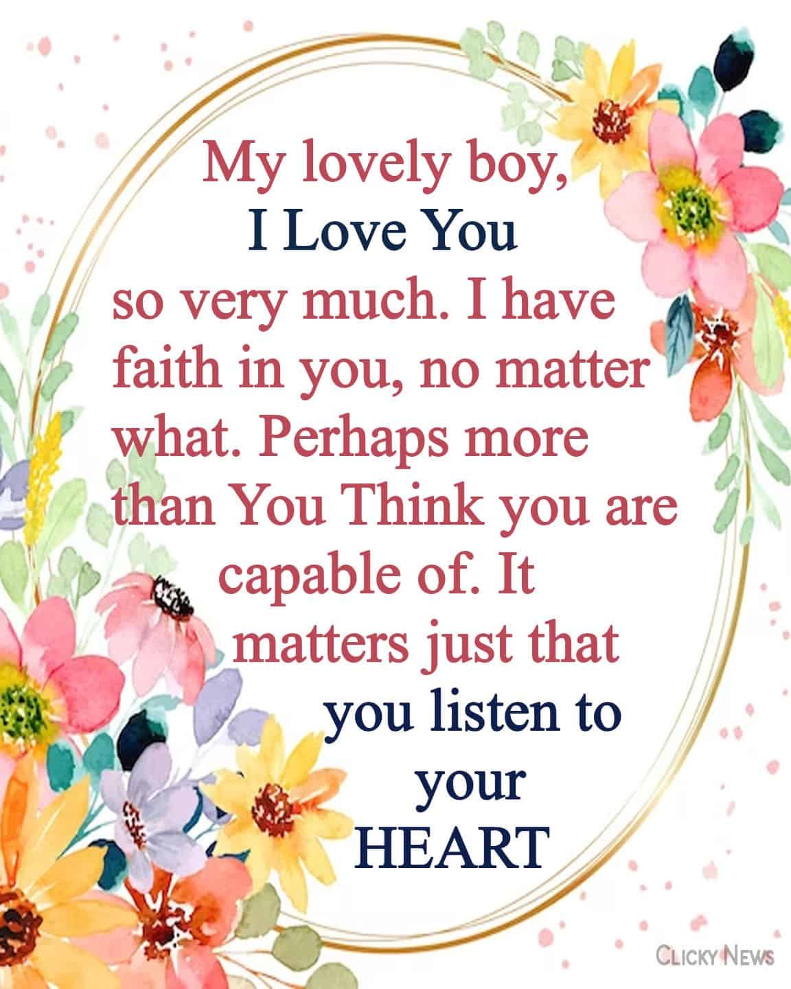 - My lovely boy, I love you so very much. I have faith in you, no matter what. Perhaps more than you think you are capable of. It matters just that you listen to your heart.