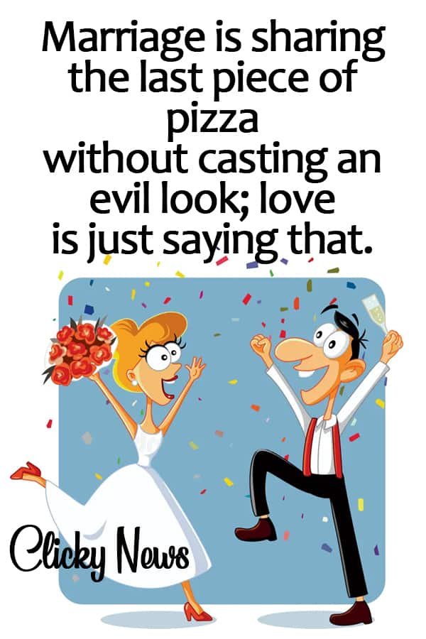 - Marriage is sharing the last piece of pizza without casting an evil look; love is just saying that.