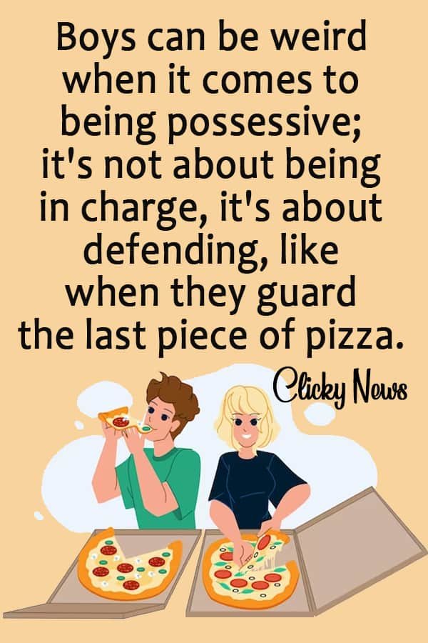 - Boys can be weird when it comes to being possessive; it’s not about being in charge, it’s about defending, like when they guard the last piece of pizza.