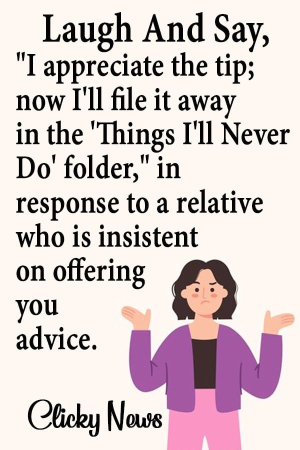 - Laugh and say, “I appreciate the tip; now I’ll file it away in the ‘Things I’ll Never Do’ folder,” in response to a relative who is insistent on offering you advice.