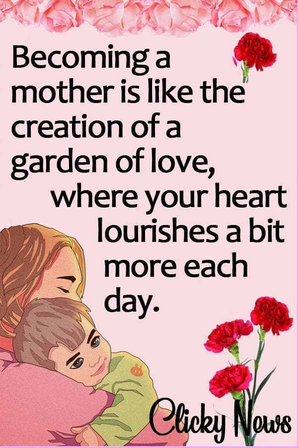 - Becoming a mother is like the creation of a garden of love, where your heart flourishes a bit more each day.
